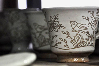 白化粧した器の表面に丁寧に文様を線彫りし、掻き落とす。それを焼成した後、上絵具で金銀や色彩を施していく。掻き落としで描いた文様の線がくっきりと器に映え、筆で線描する従来の絵付けとは異なる表情を生み出している。
